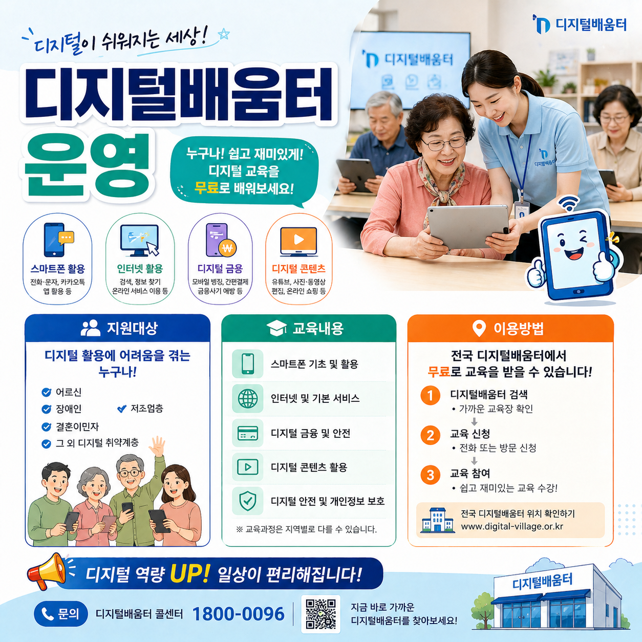 디지털 배움터는 과학기술정보통신부와 한국지능정보사회진흥원(NIA)이 공동으로 운영하는 디지털 포용(Digital Inclusion) 정책입니다. 여기서 디지털 포용이란, 소득·나이·지역 등의 차이로 디지털 서비스 접근에 불평등이 생기는 것을 막고, 누구나 동등하게 디지털 환경에 참여할 수 있도록 지원하는 개념입니다. 단순한 컴퓨터 교육이 아니라 사회적 격차 해소를 목표로 한다는 점에서, 정책의 방향 자체가 다릅니다.