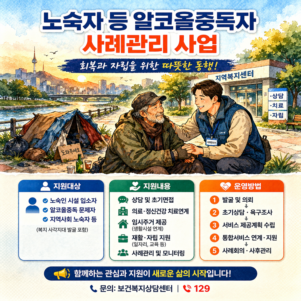 결국 이 사업의 효과는 단기 참여율이나 프로그램 이수 건수가 아니라, 해당 대상자가 1년, 2년 후에 어디에 있는지로 평가해야 합니다. 제가 이 사업을 다르게 보게 된 건 그 지점이었습니다. 알코올 사용장애는 당뇨나 고혈압처럼 관리가 필요한 만성질환에 가깝습니다. 그런 만큼 사례관리도 단발성이 아닌 장기적 관점으로 설계되어야 하고, 그것을 뒷받침할 전문 인력과 예산이 안정적으로 갖춰져야 합니다. 궁금한 점이 있다면 보건복지상담센터(☎129)나 정신건강상담전화(☎1577-0199)에 문의해보실 수 있습니다.