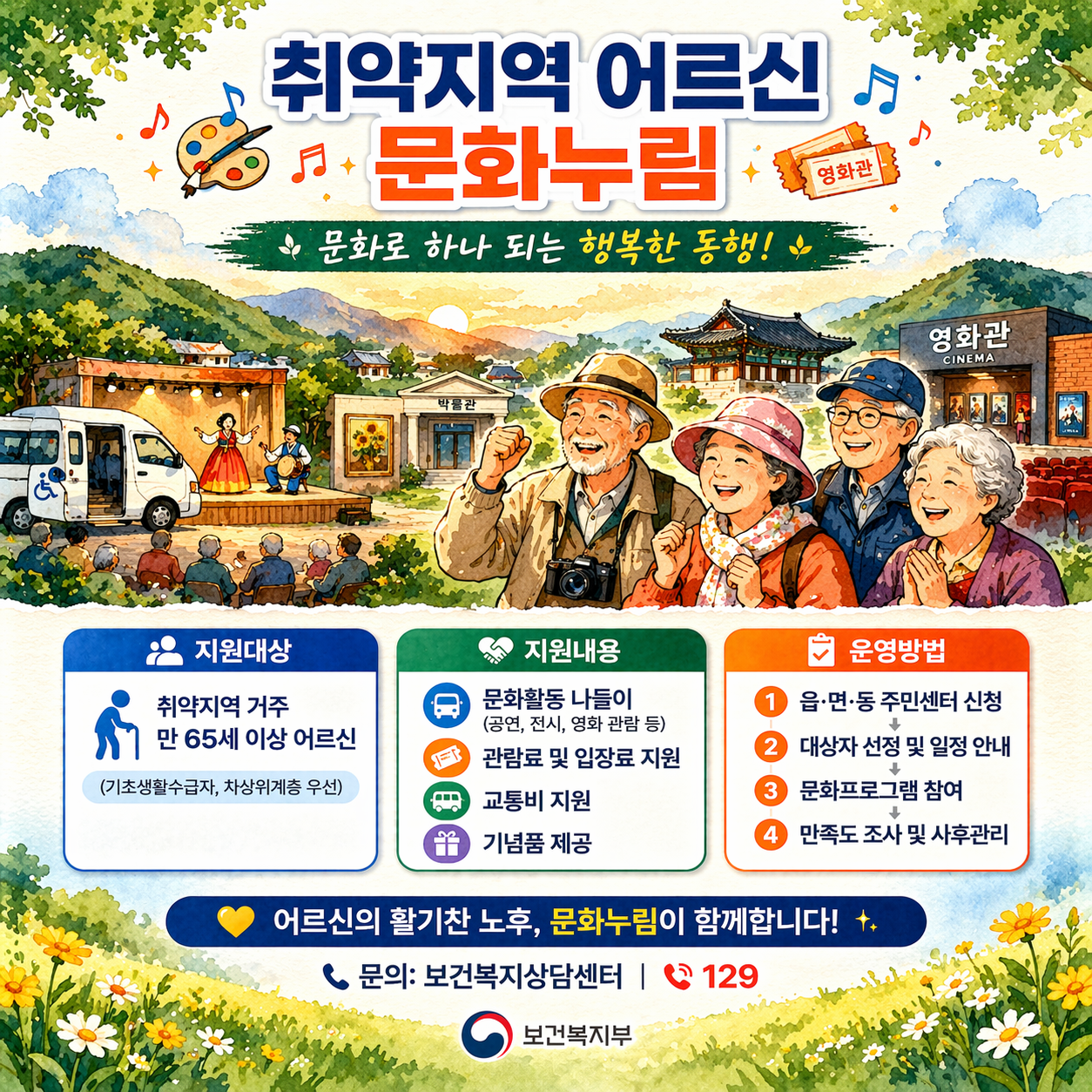 결국 이 사업이 단순한 문화 지원을 넘어 어르신들의 삶 속에 실질적인 변화를 만들려면, 더 많은 지역에서 꾸준히 운영되고 참여 기회가 넓어지는 방향으로 가야 한다고 생각합니다. 제도는 마련됐으니, 이제는 실행의 밀도가 관건입니다. 거주 지역에 해당 프로그램이 있는지 확인해 보시고, 주변 어르신께도 알려드리면 생각보다 큰 변화가 생길 수 있습니다.