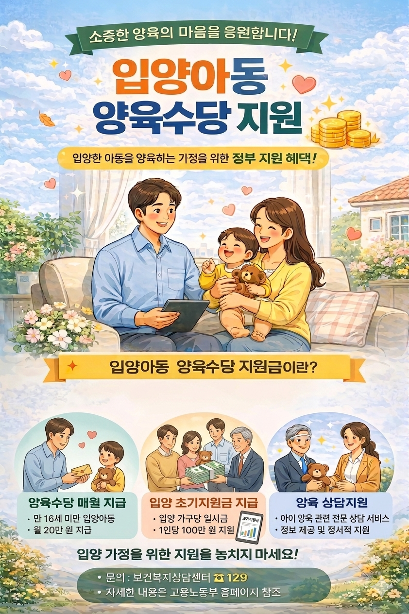 - 지원 대상: 입양특례법에 따라 국내에 입양된 아동 (소득·재산 자산조사 없음)
